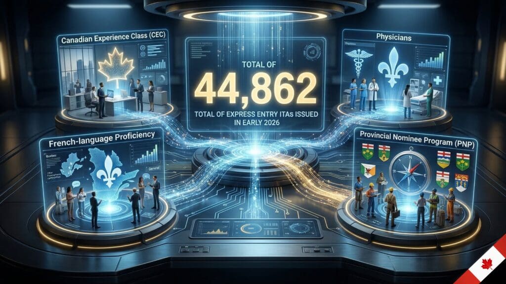 Canada’s Express Entry system has already issued 44,862 Invitations to Apply (ITAs) in just over the first two months of 2026, reflecting an aggressive pace of invitations early in the year.